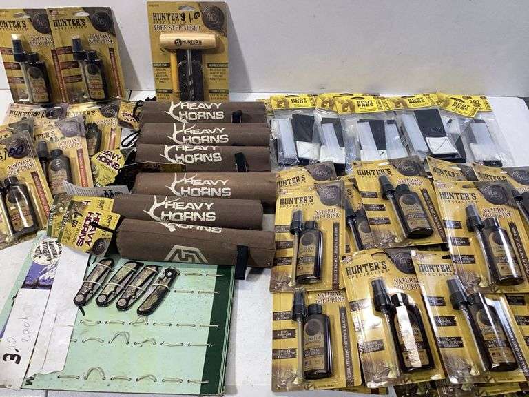 LOT 228 - Resellers hunting lot (7) Buck urine, (6) Rattle bags, (27) Doe urine, (13) Boot pads, (4) Pocket kn